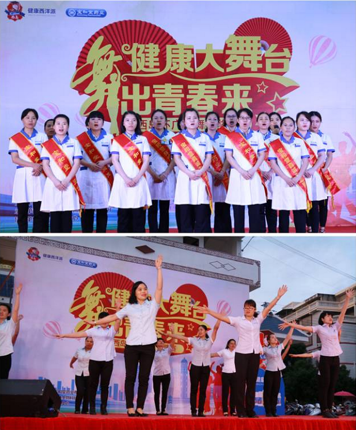 西岛杯广场舞大奖赛初赛开始前,宝和堂员工代表合唱宝和堂之歌,表演舞蹈《向前冲》。